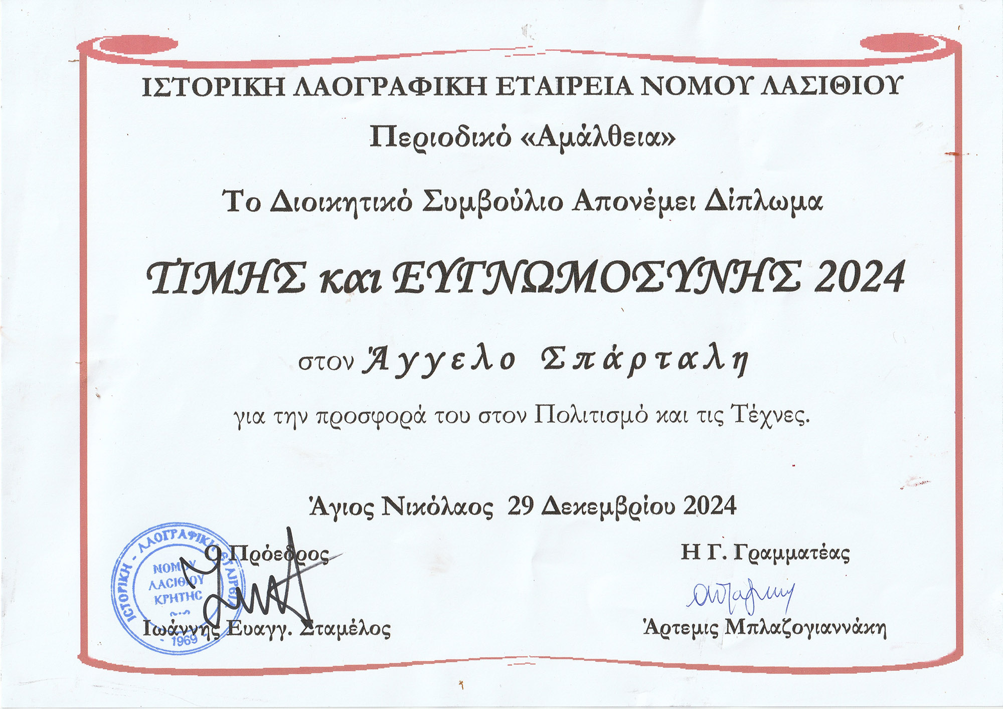 and Folklore Association of Lasithi awarded him a diploma of “Honour and