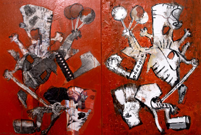 . double portrait of a child with dog and balloons . 2003, 180 x 120 cm oil and mixed media on canvas .