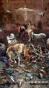 ΞΑΝΑΣΤΑΥΡΩΝΕΤΑΙ Αυτός ο πίνακας του γιού μου είναι ξεχωριστός και πρωτότυπος. Απαιτεί προσέγγιση νεωτερικού ποιήματος. Μόλις τον πρωτοείδα μέσα στο εργαστήρι ένιωσα την ανάγκη να γράψω, δε μου είχε ξανασυμβεί. Οι ελάχιστες γνώσεις μου για τα εικαστικά πάντα μου στέκονταν εμπόδιο, όχι όμως και τώρα. Ο κλονισμός που ένιωσα στη θέα αυτού του έργου έκαμψε με μιας όλες μου τις αναστολές. Οι απόψεις μου είναι φυσικά προσωπικές και εκφράζουν τη δική μου αισθητική άποψη. Ο Ιησούς έχει υποστεί την οδυνηρή Σταύρωση. Κείτεται στο άνω μέρος του πίνακα, νεκρός, με μισόκλειστα θλιμμένα μάτια. Τα λαβωμένα χέρια και πόδια του, μάρτυρες της θυσίας του για την σωτηρία του ανθρώπου. Οι δύο ληστές αιωρούνται εκατέρωθεν του θείου σώματος, σε μια απέλπιδα προσπάθεια να ξεφύγουν από το μαρτύριο τους, με πείσμα ως ακροβάτες τσίρκου προσπαθούν να σπάσουν τα δεσμά τους. Έρχεται στο νου μου η εικόνα του καθημερινού ανθρώπου που πασχίζει να απαλλαγεί από τα βάσανα του, αλλά διαρκώς αιωρείται απελπισμένος ανάμεσα στα «πρέπει» αλλά και στα «θέλω» που του επιβάλλονται. Στο σύγχρονο κόσμο, στο κόσμο του «τσίρκου» εντάσσεται και το θέαμα του γύφτου με την αρκούδα και το μαντολίνο στο στήθος, σαν ξεκούρδιστο. Στο μέσο του πίνακα, ο γέροντας τσιγγάνος περιφέρεται σχεδόν αδιάφορος στον ίσκιο του Σταυρού με παρέα ένα σκυλί κοκκαλιάρικο που ψάχνει χαμηλότερα για τροφή. Στον κορεσμένο από απορρίμματα κόσμο μας ψάχνουν οι ξεχασμένοι της ζωής να τραφούν από τα περισσεύματα των πλουσίων. Αριστερά του γύφτου ένα όμορφο πρόβατο. Η αθώα ματιά όσων βλέπουν τη ζωή μέσα από τη χαμένη μας αθωότητα. Εικόνες της νεαρής ζωής του Χριστού τον αναπαριστούν ανάμεσα σε κοπάδι προβάτων, «ο αμνός του Θεού, ο αίρων τας αμαρτίας του κόσμου» αλλά και ανάμεσα σε μικρά παιδιά, «άφετε τα παιδία ελθείν προς εμέ». Τα κρανία στο έδαφος μαρτυρούν την καταγωγή των θανόντων. Δεξιά του γύφτου, το διαμαντένιο κρανίο του πλούσιου, πλην όμως θνητού κατόχου του, βρίσκεται ψηλότερα από τα άλλα, σε περίοπτη θέση, μάταια όμως. «Τις εστί βασιλεύς ή στρατιώτης, πλούσιος ή πένης». Πικρή ειρωνεία! Ο θάνατος εξισώνει τους ανθρώπους. Τα όργανα των αρχαιολόγων στο κάτω μέρος του πίνακα μαρτυρούν την προσπάθεια του ανθρώπου να ανακαλύψει ό,τι το παρελθόν του έχει αποκρύψει και να βρει έρεισμα στη ζωή του. Ένα βέλος στα αριστερά δείχνει το Βορρά, μια κλίμακα στα δεξιά μετρά τα εκατοστά. Βασανίζεται ο σύγχρονος άνθρωπος μεταξύ πίστης και αβεβαιότητας, για τα πιστεύω του, τις πράξεις, τις ευχές και την προοπτική να δει έναν καλύτερο κόσμο. Και πάνω από το προσανατολισμένο βέλος, κάτω από τα πίσω πόδια του σκύλου, πεταμένος ανάμεσα στα οστά, κείτεται ο μηχανισμός των Αντικυθήρων. Μια νύξη στη γνώση που συγκεντρώνει ο άνθρωπος αιώνες για να τη σκορπίσει σε μια στιγμή. Μια βιβλιοθήκη της Αλεξάνδρειας που φλέγεται ξανά. Το πεινασμένο σκυλί… τα εκατομμύρια των ανθρώπων που δυστυχούν. Το διαμαντένιο κρανίο… η ματαιοδοξία των άφρονων πλουσίων. Οι δύο ληστές… η αγωνία των σύγχρονων να ισορροπήσουν. Ο γύφτος που πάει αδιάφορα στη δουλειά του… η κοινωνία μας που αναπαράγει τις ανισότητες. Ο θλιμμένος Χριστός… η απόγνωση του ανθρώπου όταν οι θυσίες του δεν βρίσκουν ανταπόκριση. Εκεί που οι άνθρωποι βασανίζονται, εκεί ο Χριστός σταυρώνεται ξανά και ξανά. Κι ακούγεται κάθε φορά και πάλι ο ψίθυρος του ληστή... «Μνήσθητί μου κύριε».
