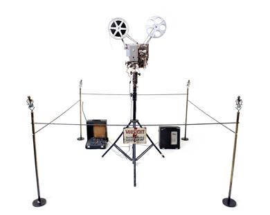 2015 | Portable 16mm film projector on a tripod stand, with an amplifier, a speaker, 4 cast masts and a warning sign. |